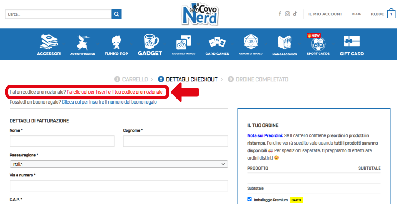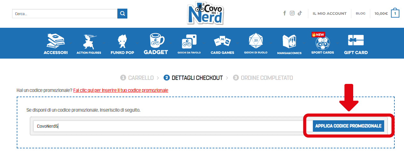 Utilizzare i codici sconto al momento del checkout su Il Covo del Nerd è semplice. Ecco i passaggi da seguire per far sì che il vostro sconto venga applicato correttamente all’ordine:
