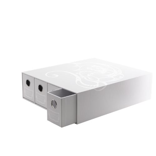 Tenere in ordine una collezione di carte da gioco non è mai stata una questione secondaria per chi le carte le ama davvero. Il Portacarte Verticale con 3 Cassetti Fortress Bianco risponde esattamente a questa esigenza, combinando funzionalità e un’estetica raffinata che lo rende degno di stare in bella mostra sulla scrivania di ogni appassionato. Questo contenitore per carte da gioco è pensato per chi cerca ordine senza rinunciare al gusto, con un’elegante decorazione tono su tono raffigurante un drago stilizzato tra elementi vegetali che gli conferisce un carattere inconfondibile.
