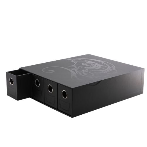 Tenere in ordine una collezione di carte da gioco non è mai stata una questione secondaria per chi le carte le ama davvero. Il Portacarte Verticale con 4 Cassetti Fortress Nero risponde esattamente a questa esigenza, combinando funzionalità e un’estetica raffinata che lo rende degno di stare in bella mostra sulla scrivania di ogni appassionato. Questo contenitore per carte da gioco è pensato per chi cerca ordine senza rinunciare al gusto, con un’elegante decorazione tono su tono raffigurante un drago stilizzato tra elementi vegetali che gli conferisce un carattere inconfondibile.