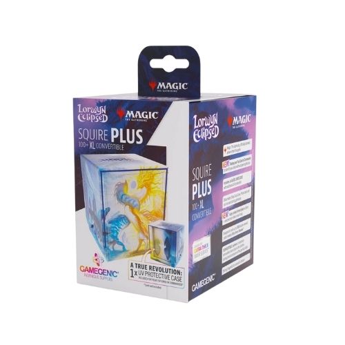 Squire Plus 100+ XL Magic: The Gathering Lorwyn Eclipsed Celestial Reunion rappresenta l’apice della qualità nei portamazzi premium per giocatori Commander e collezionisti che apprezzano l’arte e la funzionalità. Questo portamazzo convertibile XL con custodia UV integrata è stato progettato per chi cerca un accessorio che sia tanto bello quanto funzionale. Conosciuto anche come deck box premium Commander, portamazzo magnetico con protezione UV o squire plus XL, convertible deck box, si distingue per il mozzafiato artwork Celestial Reunion dell’espansione Lorwyn Eclipsed stampato in full color su superficie Armorfyber texturizzata, che raffigura due magnifiche fenici in un abbraccio cosmico rappresentando la dualità tra fuoco dorato e ghiaccio azzurro, simbolo perfetto dell’equilibrio tra luce e oscurità tipico del piano di Lorwyn.