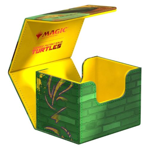 L’interno si apre rivelando un vano giallo brillante con i loghi ufficiali di Magic: The Gathering e Teenage Mutant Ninja Turtles, mentre il retro è rivestito con una texture a mattoni verdi e grafiche di artigli.