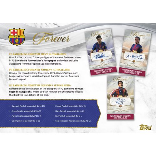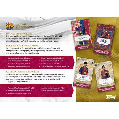 Forever Men’s & Women’s Autographs raccoglie le firme dei protagonisti della rosa maschile e femminile del Barcellona, con parallele numerate fino a /125 e varianti rarissime da 1/1 in Gold FoilFractor. Forever Legends Autographs celebra i grandi nomi della storia blaugrana: da Messi a Luis Suárez, passando per Romario, ogni autografo è un frammento di calcio eterno. Con le Barcelona Identity Autographs, le parallele non cambiano solo colore, ma prendono il nome dei valori del club: Teamwork, Humility, Effort, Ambition e Respect, fino alla rarissima Respect numerata 1/1.