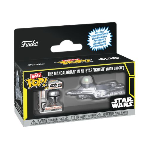 Conosciuto anche come set Funko con nave del Mandaloriano o Bitty POP! Rides N1 Starfighter Grogu, si distingue per la finitura argentata brillante e per la Bitty POP! esclusiva di The Mandalorian inclusa nella confezione.