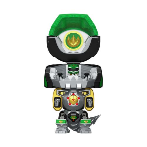 Il Dragonzord si presenta nella sua forma iconica con corpo verde metallizzato decorato con dettagli dorati sulle spalle. La testa del drago meccanico in verde brillante con occhi rossi e denti argenti può essere aperta per rivelare il cockpit interno dove il Green Ranger prende posto. Il petto grigio presenta il distintivo centrale rosso e dorato che identifica immediatamente questo Zord. Le braccia e le gambe mantengono i dettagli meccanici originali con accenti verdi e grigi. Il Green Ranger Bitty POP può essere rimosso completamente dallo Zord e posizionato separatamente, mostrando il suo iconico costume verde e oro con lo scudo Dragon Shield sul petto. La coda grigia dello Zord completa il look da dinosauro meccanico. Questa doppia modalità di display permette di mostrare sia il Dragonzord completo che il Green Ranger singolarmente.