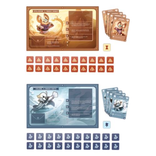 Ogni dettaglio di questa espansione strategica è stato curato per integrarsi perfettamente con il gioco base. Le 2 plance Saggio presentano illustrazioni dettagliate in stile cartoon degli animali elementali che rappresentano le nuove fazioni, con artwork coerente con l’estetica del gioco originale. I segnalini a doppia faccia permettono di tracciare facilmente gli effetti di erosione e vento favorevole, mentre le 20 nuove carte del Mercato Elementale espandono le opzioni disponibili per tutti i giocatori.