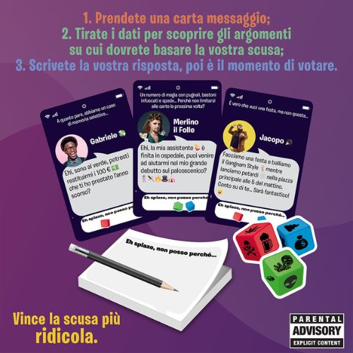 - Scrivete la vostra risposta sul blocchetto in un minuto, poi un giocatore legge tutte le scuse ad alta voce — in forma anonima — e tutti votano la più divertente