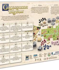 La Big Box è la scatola perfetta per immergersi nel mondo di Carcassonne! Oltre al gioco base sono contenute ben 11 espansioni, di cui 7 incluse solo in questa scatola! Nuovi personaggi e regole, per sfide sempre nuove e differenti. Aggiungete le espansioni alle vostre partite e create la vostra combinazione preferita del mondo di Carcassonne! Carcassonne è un classico intramontabile dei giochi da tavolo, con milioni di giocatori nel mondo e vent’anni di storia. Immediato, ma di grande profondità, è un titolo strategico perfetto per ogni età, ideale anche per due giocatori. Quest’edizione non porta cambiamenti nel regolamento o nel contenuto, ma solo modifiche grafiche alla copertina e al regolamento.