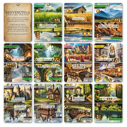 Le 140 carte di questo gioco di costruzione feudale coprono una varietà notevole di tipologie: terreni come prati, foreste e montagne, edifici come granai, castelli e sedi centrali, e personaggi come mercanti e figure del villaggio, tutti illustrati in uno stile pittorico medievale curato e coerente.