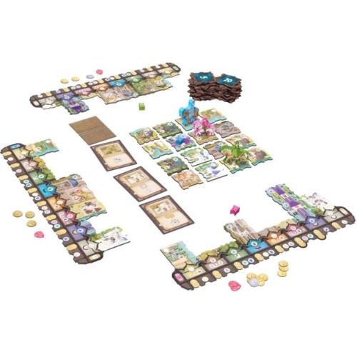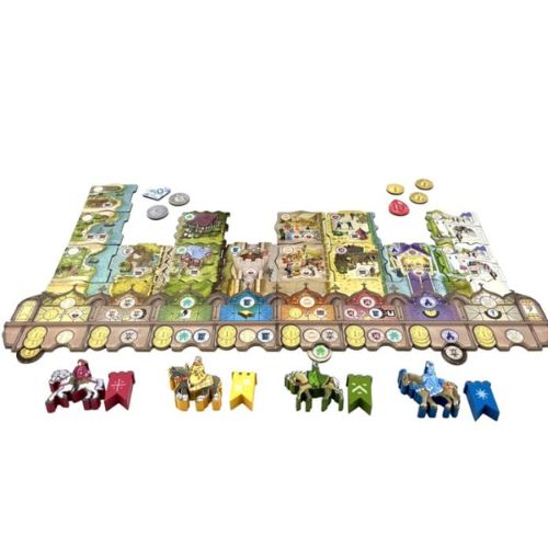 - Componenti: Tessere illustrate, meeple in legno serigrafati, plance giocatore, carte, monete