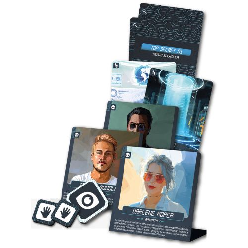 - Contenuto: 1 segnalino Capogruppo, 14 segnalini Azione, 8 carte Luogo, 11 carte Top Secret, 7 carte Ritratto, 14 carte Storia, 7 carte Relazioni, 7 carte Obiettivi, 2 carte Introduzione, 2 carte Soluzione, 1 carta Riassunto del Gioco, regolamento