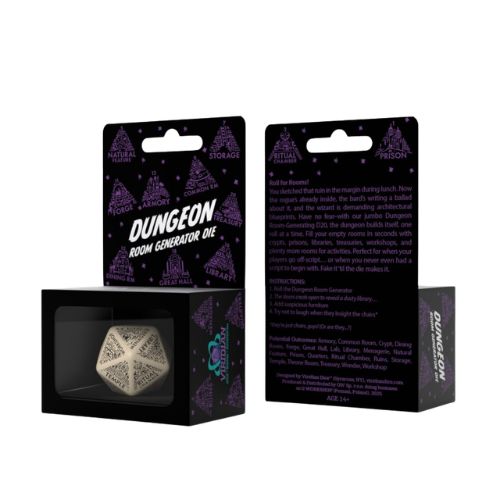 Dungeon Room Generator Die è il dado che ogni master di gioco di ruolo dovrebbe avere sul tavolo. Quante volte i tuoi giocatori hanno preso una direzione imprevista, aprendo una porta su cui non avevi ancora scritto nulla? Con questo dado D20 generatore di stanze, il dungeon si costruisce da solo, un tiro alla volta. Progettato da Viridian Dice e prodotto da Q Workshop, si distingue per le sue incisioni nitide e dettagliate su ogni faccia, con illustrazioni in stile fantasy che rendono ogni risultato immediatamente evocativo. La colorazione beige crema con incisioni nere gli conferisce un aspetto antico e pergamenato, perfettamente in tema con l’estetica da dungeon.
