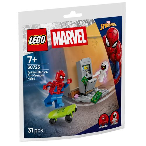LEGO Marvel Spider-Man numero 30725 Rapina Anti-Venom rappresenta un concentrato di azione urbana in formato compatto, ricreando un classico inseguimento tra l’eroe arrampicamuri e il misterioso criminale Anti-Venom. Questo set polybag d’azione Marvel è stato progettato per giovani fan di Spider-Man e collezionisti Marvel che cercano scene dinamiche di crimine urbano con elementi giocabili. Conosciuto anche come LEGO Uomo Ragno inseguimento o Spider-Man vs Anti-Venom Heist polybag, si distingue per lo scenario realistico della rapina al bancomat stradale e l’insolito mezzo di trasporto dello skateboard che Spider-Man usa per inseguire il malvivente in fuga con il bottino.