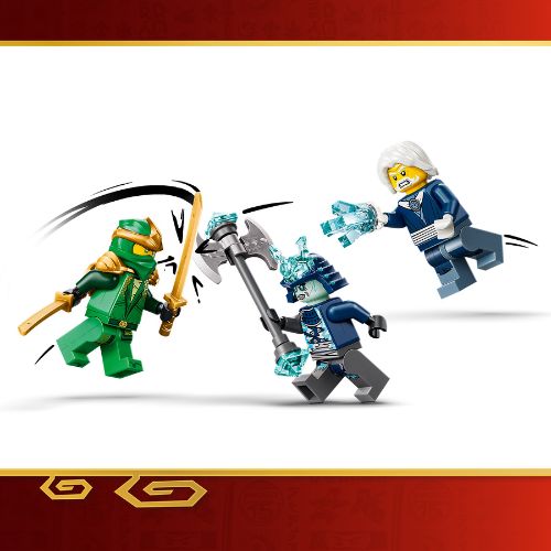 Questo mech giocattolo contiene diverse parti del corpo snodabili, tra cui ali, gambe, piedi, braccia e spalle e un cockpit per una minifigure. È dotato anche di una grande spada e, per la prima volta in assoluto, di un grande scudo che può essere riutilizzato posizionandolo sullla schiena come delle ali. Il kit di costruzione include 3 minifigure: Lloyd e Grimfax dello show TV, oltre a un Maestro del Ghiaccio elementale collezionabile su un supporto. I fan dei ninja possono costruire ciascun playset con confidenza utilizzando l’app LEGO Builder: ingrandisci, ruota in 3D e tieni traccia dei progressi con istruzioni digitali facili da seguire. Il set da costruzione contiene 1.293 pezzi.