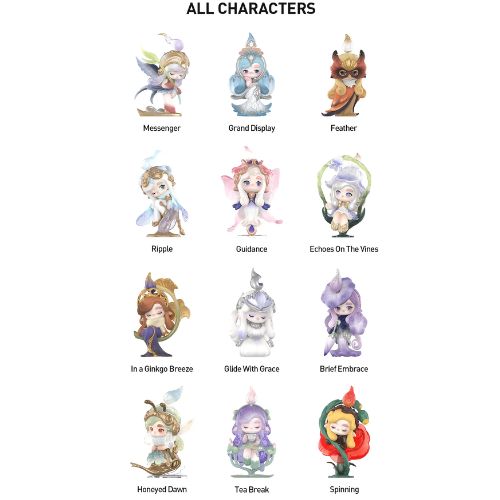 Ogni figura da collezione Art Nouveau della serie porta con sé un’identità visiva fortissima: da Feather, con la sua maschera da gufo e la fiamma trasparente sulla testa, a Ripple, con le ali bianche e i dettagli dorati che la avvolgono come correnti d’acqua, fino a Spinning, immersa nei petali rossi di un fiore che si apre. L’uso di materiali traslucidi, combinato con rivestimenti speciali e sabbia fosforescente in alcuni soggetti, rende queste statuette capaci di cambiare aspetto con la luce.