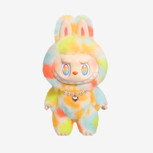 Conosciuta anche come bambola Labubu arcobaleno o Labubu tie-dye plush doll, si distingue per la palette vivace che mescola giallo lime, azzurro, arancio, verde neon e rosso corallo in un effetto cromatico che ricorda l’energia pura di un concerto sotto le stelle.