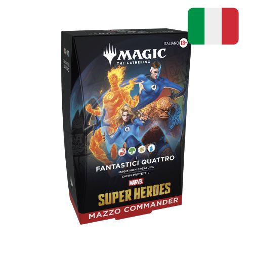 I mazzi Commander sono pronti all’uso e contengono tutto il necessario per giocare al formato multigiocatore più popolare di Magic. Magic: The Gathering | Marvel Super Heroes include quattro diverse versioni di mazzi Commander.